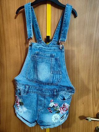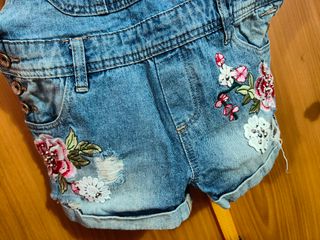 Classico modello di salopette con pantaloncini corti colore blu con inserti scoloriti e strappati e in rilievo applicazione di fiori colorati. Indossata a malapena 1 volta vendo per taglia sbagliata