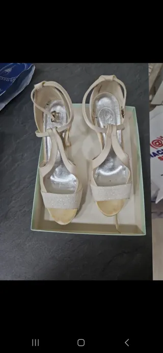 Eleganti scarpe da sposa con tacco, perfette per il tuo giorno speciale. Usate solo una volta ma da lavare e pulire - Dettagli glitter sul tacco. - Cinturino alla caviglia per una maggiore stabilità.