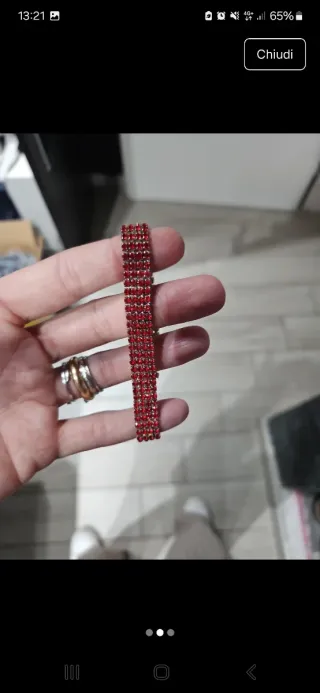 Elegante bracciale con perle rosse e dettagli dorati. - Perle rosse lavorate. - Ciondolo rosso a forma di goccia. - Elementi dorati tra le perle.
