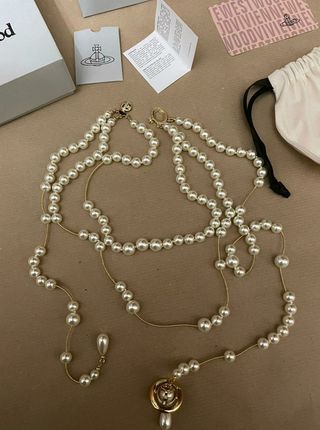 Elegante collana Vivienne Westwood con perle e dettagli dorati. - Design a più fili. - Ciondolo pendente con perla. - Chiusura a moschettone dorata.