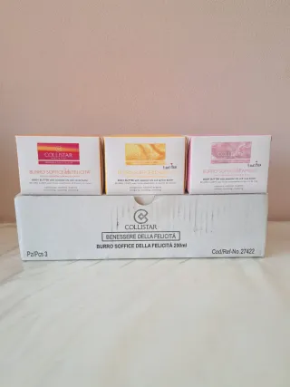 Set composto da 3 Burro Soffice COLLISTAR MILANO da 200ml. Nuovi. 1 Burro Soffice della Felicità - con Oli essenziali e Burro di Cacao 1 Burro Soffice di Energia - con Oli essenziali di Albicocca 1 Burro Soffice dell'Amore - con Oli essenziali e Burro di Rosa