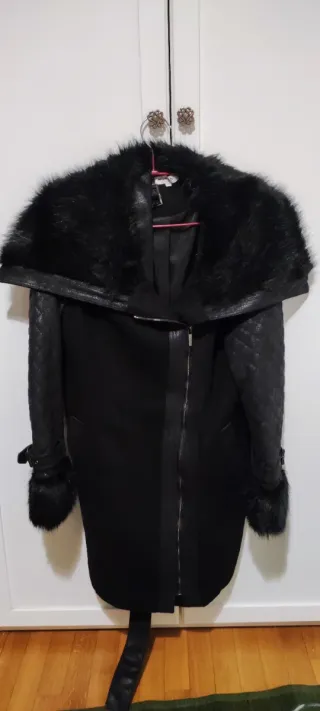 Elegante cappotto nero con un ampio collo in pelliccia sintetica. - Maniche in ecopelle trapuntata. - Chiusura frontale con zip. - Cintura in vita. - Dettagli in pelliccia sui polsini.