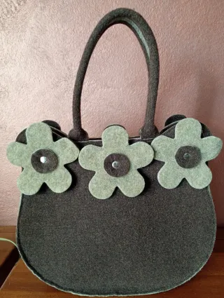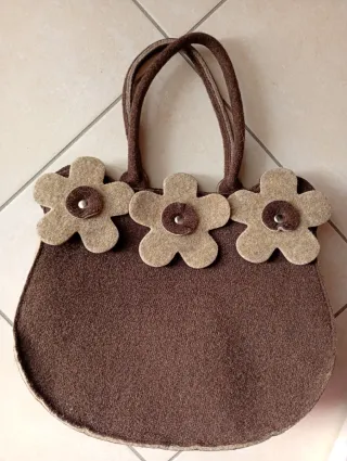 Borsa in panno marrone con decorazioni a forma di fiore. - Materiale in feltro. - Dettagli floreali applicati. - Manici resistenti.