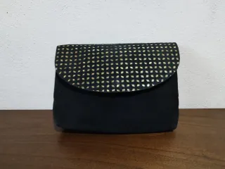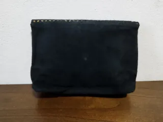 Borsa pochette da sera vintage in pelle scamosciata Vogue, con intarsi oro. Colore nero e oro. Condizioni molto buone (vedere foto). Misure: Altezza 22 cm Larghezza 28 cm Profondità 6.5 cm
