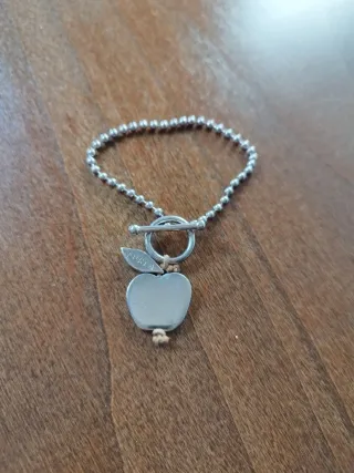 Bracciale Furla in argento 925 con punzoni, con chiusura a T e ciondolo mela. Lunghezza 17.5 cm. Ottime condizioni. Con sacchetto in raso Furla.