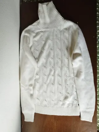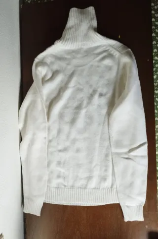 Maglione pullover a collo alto Egg family, con trecce decorative sul davanti. Unisex. Color panna. Taglia S. Ottime condizioni