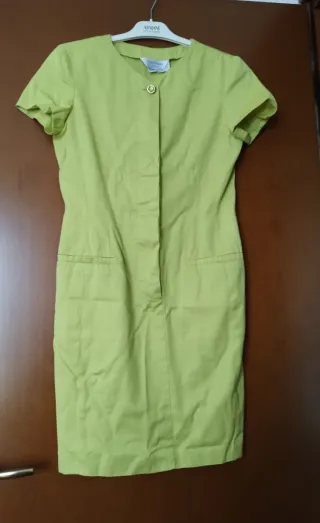 Vestito abito sagomato in cotone Max Mara, a maniche corte, con tasche sul davanti (ancora cucite) e bottoni in madreperla. Colore giallo/verse acido. Taglia 42. Mai indossato, senza cartellino.