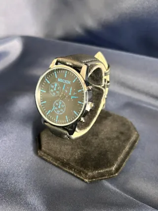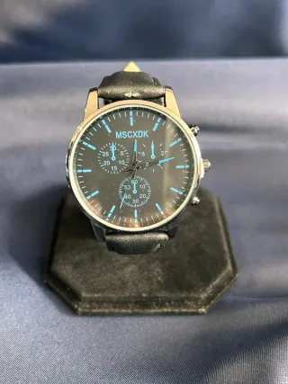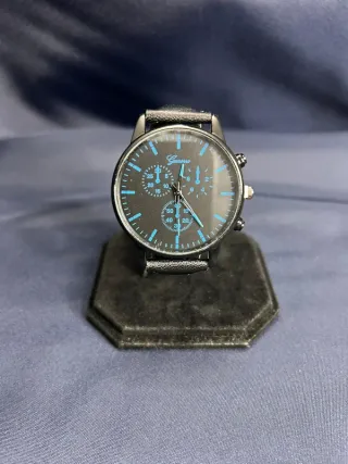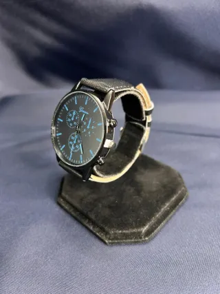 Orologio al quarzo dal design elegante e moderno, con cinturino nero in similpelle con cuciture a vista, morbido, regolabile e confortevole. Il quadrante nero è arricchito da dettagli blu, che aggiungono un tocco di colore discreto e raffinato, ideale per chi cerca uno stile sobrio ma originale. Perfetto per completare sia look casual che più eleganti. - Cinturino in similpelle nera. - Movimento al quarzo. - Design moderno con quadrante analogico.