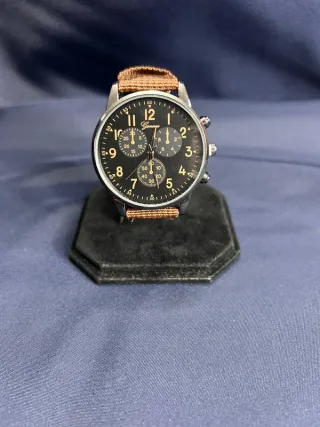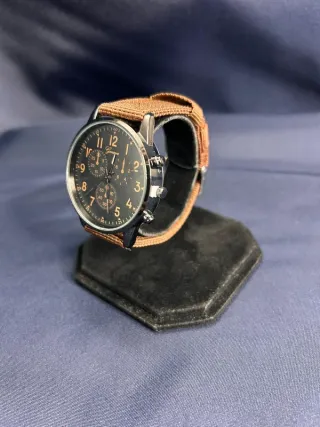 Orologio al quarzo dal design casual e versatile, con cinturino in tela marrone resistente e regolabile, comodo da indossare ogni giorno. Il quadrante nero è arricchito da dettagli marroni, che donano un tocco sobrio e raffinato, facile da abbinare a diversi look. Un accessorio perfetto per chi cerca stile e praticità, ideale per l’uso quotidiano o per completare un outfit casual con eleganza. - Quadrante nero. - Dettagli color marrone sul cinturino.