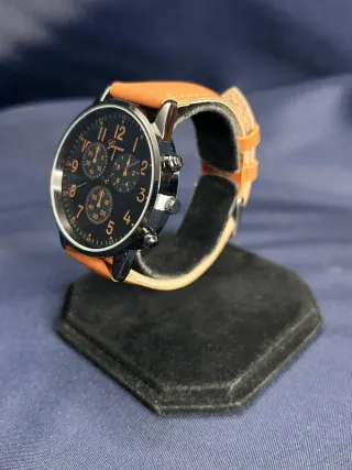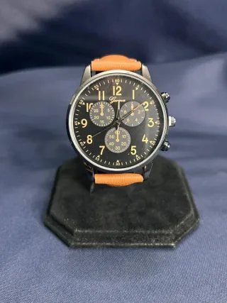Elegante orologio al quarzo con cinturino in cuoio marrone, comodo e resistente. Il quadrante nero è arricchito da dettagli in bronzo, rosso e bianco, per un look raffinato e moderno. - Cassa in metallo scuro. - Cinturino in pelle marrone. - Design con quadranti secondari.