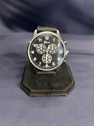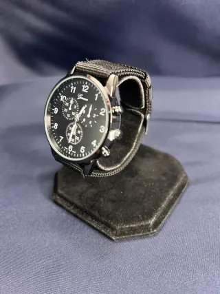 Orologio al quarzo dal look casual e leggero, con cinturino in tela resistente e regolabile, pratico e comodo da indossare ogni giorno. Il quadrante nero con dettagli bianchi offre un design semplice e moderno, facile da abbinare a qualsiasi outfit. - Cassa in metallo color argento. - Quadrante nero con indici e lancette a contrasto. - Cinturino in tessuto nero.