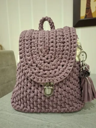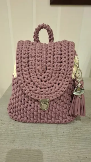 Zainetto fatto a mano all'uncinetto, un pezzo unico. - Realizzato in fettuccia. - Dettagli in contrasto. - Chiusura a scatto metallica. - Ciondolo decorativo con nappa.