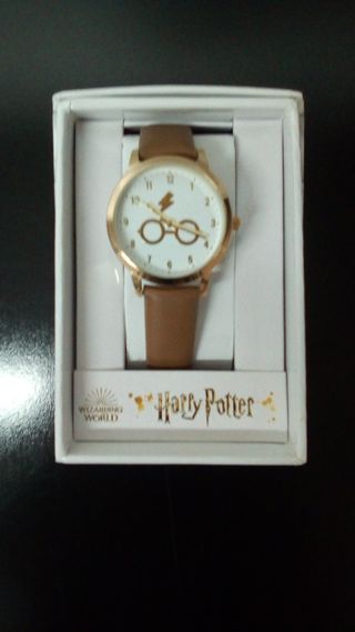 Orologio da polso con cinturino marrone e cassa dorata, ispirato al mondo di Harry Potter. - Design con occhiali e fulmine. - Logo Wizarding World e Harry Potter sul quadrante.