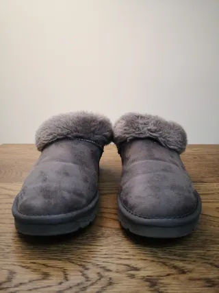 Comode pantofole grigie con un caldo rivestimento interno in pelliccia sintetica. - Materiale esterno scamosciato. - Fodera interna in pelliccia sintetica. - Suola antiscivolo.