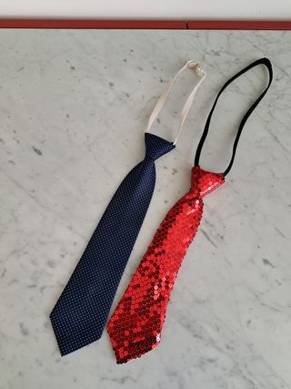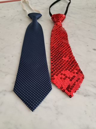 2 cravatte bimbo cerimonia e festa 2 cravatte bimbo una per cerimonia e una per festa Con nodo permamente ed elastico Cravatta blue in seta lunghezza 33 larghezza 8 cm Cravata rossa con paillette lunghezza 29 larghezza 7 cm Ottimo stato Il prezzo è per entrambe