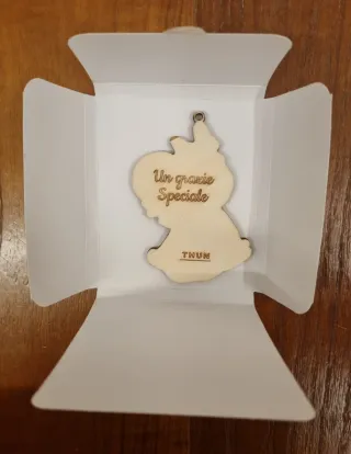 Bellissimo chiudipacco a forma di angelo, nuovo e mai usato. Realizzato in legno. Perfetto per decorare i tuoi pacchi. THUN - Design con angelo che abbraccia un sacco. - Dettagli curati e colorati.