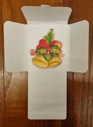 Bellissimo chiudipacco THUN a forma di campane natalizie. Realizzato in legno - Decorazione con fiocco rosso e agrifoglio. - Dettagli color oro e rosso. - Nuovo nella sua confezione originale