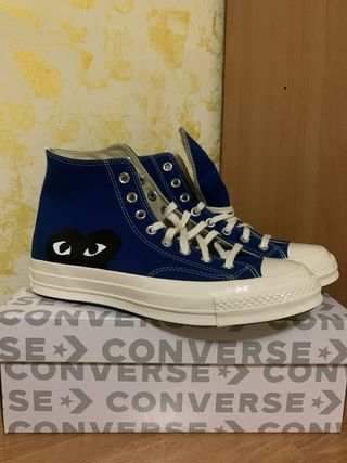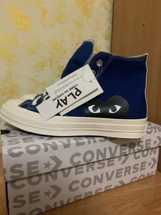 Iconiche sneakers Converse Chuck Taylor All Star, in collaborazione con Comme des Garçons PLAY. Il design presenta il classico cuore PLAY sul lato. - Tomaia in tela blu. - Dettagli bianchi a contrasto. - Suola in gomma. - Logo PLAY sul lato. indossate 1 sola volta vendo per numero errato