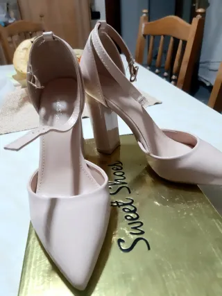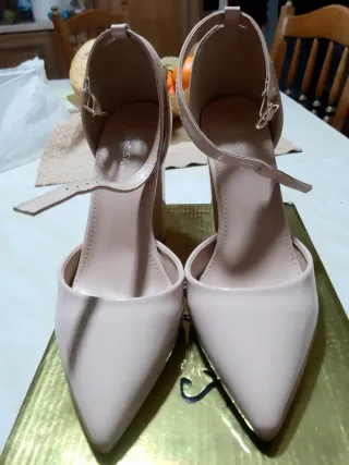 Eleganti scarpe con tacco e finitura lucida. - Modello a punta. - Cinturino alla caviglia regolabile. - Tacco alto.Usate una sola volta Comode avendo il tacco largo