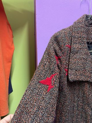 Elegante cappotto Desigual con un design unico. - Fantasia tweed marrone con dettagli rossi. - Chiusura con bottoni. - Polsini con bottoni. - Collo a revers.