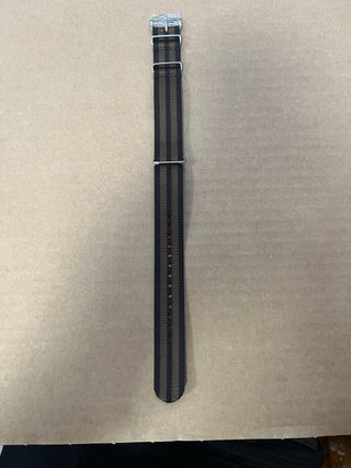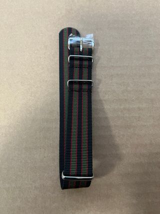 Cinturino in stile James Bond per orologi. - Tessuto resistente con strisce nere, verdi e rosse. - Fibbia in metallo argentato. - Passanti in metallo. Larghezza 20mm Lunghezza 280mm