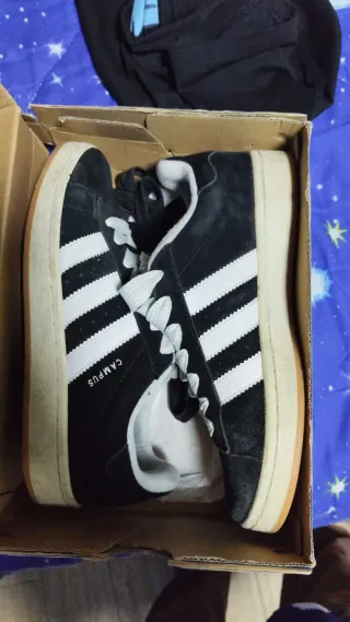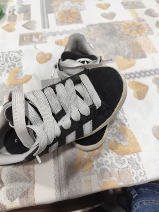 Scarpe Adidas modello Campus. - Tomaia in suede nero. - Strisce laterali bianche. - Logo CAMPUS stampato sul lato. - Suola in gomma color crema e marrone. PS SENZA SCATOLA ORGINALE