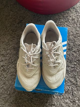 Vendo un paio di scarpe Adidas bianche, perfette per l'estate. Sono in buone condizioni, leggermente usurate ma ancora in ottimo stato. - Modello casual, adatte a diversi outfit. - Suola in gomma, colore crema leggermente ingiallito dal sole. - Lacci bianchi.