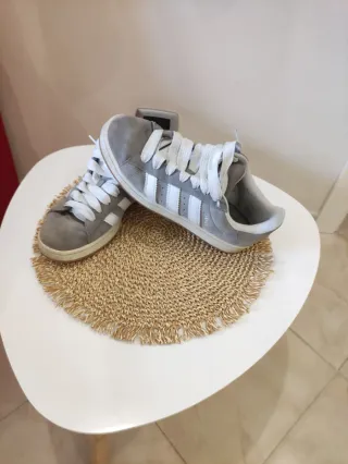 Scarpe Adidas modello Campus in camoscio grigio. - Tomaia in camoscio. - Strisce laterali Adidas bianche. - Logo Adidas sul tallone e sulla linguetta.