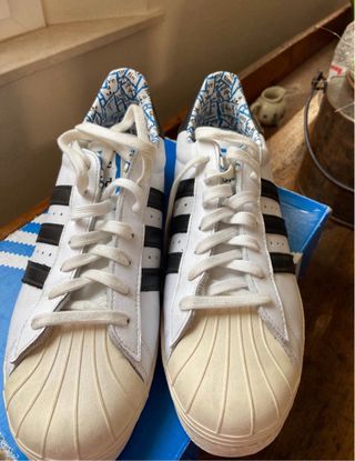 2 paia Scarpe da ginnastica Adidas in due varianti di colore. - Tomaia blu con suola in gomma. - Tomaia bianca con dettagli a righe nere. Le scarpe da ginnastica sono totalmente nuove svendute rispetto prezzo D'Acquisto, c'è un margine di trattativa, non idonee al mio piede.