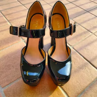 Eleganti scarpe con tacco in vernice nera. Numero 36. - Modello Mary Jane con cinturino. - Tacco largo, 12 cm e plateau. - Finitura lucida.