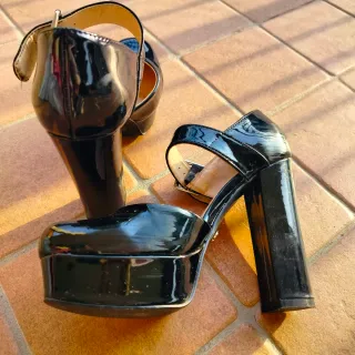 Eleganti sandali neri con plateau,tacco 12 cm e cinturino alla caviglia.Come nuovi. - Materiale scamosciato. - Dettaglio t-strap. - Chiusura con fibbia dorata.