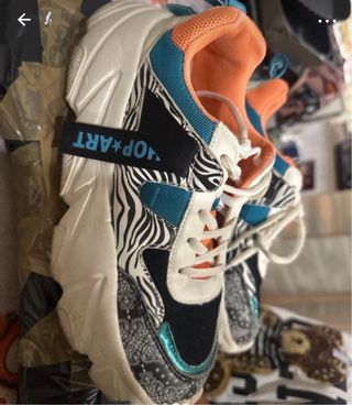 Scarpe Shop Art con un design unico e vivace. - Toma in bianco e nero. - Dettagli in blu e arancione. - Suola spessa e comoda.