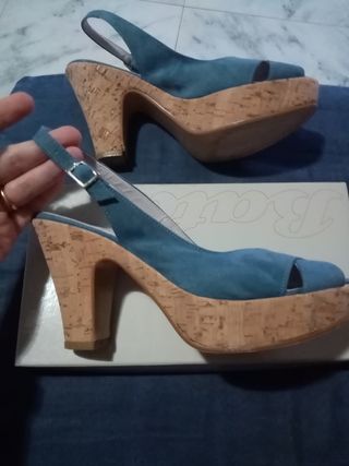 Sandali Zara con zeppa in sughero e dettagli metallici nuovi mai stati indossati in vera pelle Numero 40 - Tomaia in tessuto blu con texture. - Doppi cinturini decorati con cerchietti metallici. - Zeppa in sughero effetto legno. - Fodera interna in materiale argentato.