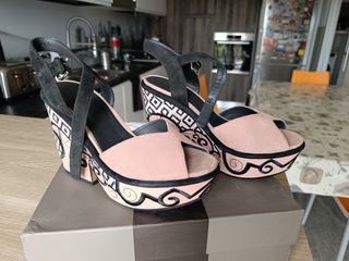 Bellissimi sandali con plateau del marchio Elvio Zanon, perfetti per occasioni speciali. Sono in ottime condizioni. Usati 2 volte in pelle e camoscio, pagati €159. Vendo x inutilizzo. - Sandali con plateau in suede rosa cipria e dettagli in nero. - Chiusura con cinturino alla caviglia. - Design elegante e raffinato. - Suola in ottimo stato.