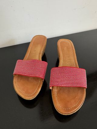 Comode ciabatte Zara con una pratica zeppa di Zara nuove mai state indossate con strass brillanti Numero 40 - Fascia superiore rossa decorata con strass bianchi. - Zeppa in sughero e suola in cuoio.