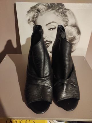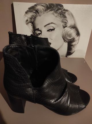Scarpa spuntata alta alla caviglia con taglio asimmetrico zip laterale con tacco largo , completamente in pelle e molto comoda . N 37