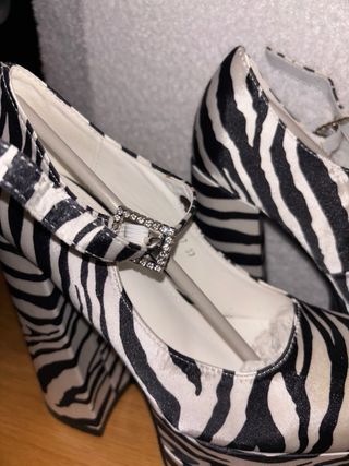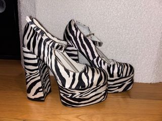 Bellissimi tacchi zebrati, perfetti per aggiungere un tocco di stile al tuo look! Sono platform, quindi molto comodi da indossare. Indossati una volta, molto comodi ma troppo alti per me - Altezza tacco: 14,5/15 - Chiusura: con cinturino alla caviglia - Colore: bianco e nero