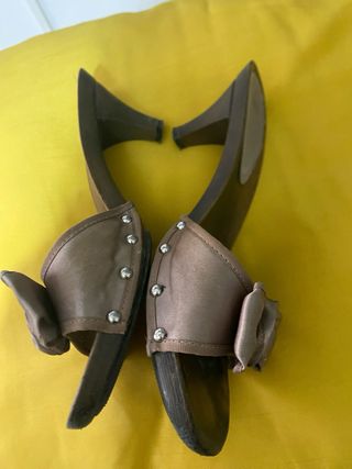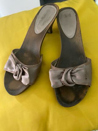 Bellissimi zoccoli in legno, colore beige e marrone chiaro. Sono comodi e perfetti per la primavera/estate. - Tacco medio. - Fibbia decorativa in raso. - Suola leggermente usurata.
