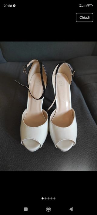 Eleganti sandali con tacco, perfetti per completare il tuo look. - Design in vernice lucida bicolore bianco e nero. - Cinturino alla caviglia con fibbia. - Punta aperta. Plateau interno Nonostante l altezza del tacco è molto comodo . Indossati una sola volta