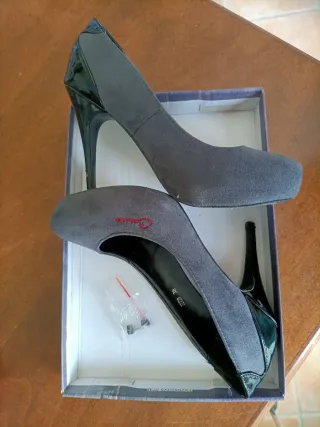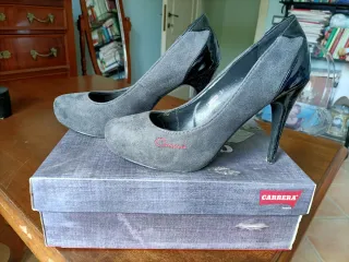 Décolleté Carrera, alla moda, grigio scuro. Misura 38. Tacco 10 cm. Scamosciate, con dettagli in pelle lucida sul tallone e sul tacco. Logo ricamato sul davanti. Usate poco, con piccoli segni dell'utilizzo, come da foto. Comode nonostante il tacco di 10 cm. Tacchetti di ricambio e scatola originale. Sono disponibile a trattative. Applico sconti se si vuole creare un set dal mio guardaroba. Nei miei pacchetti, confezionati con cura, lascio sempre un regalino per i miei acquirenti ❣️