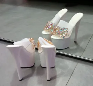 Scarpe con tacco alto e plateau, perfette per aggiungere un tocco di glamour. - Decorazioni con strass e dettagli dorati. - Tomaia trasparente e tacco bianco.