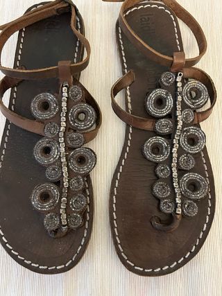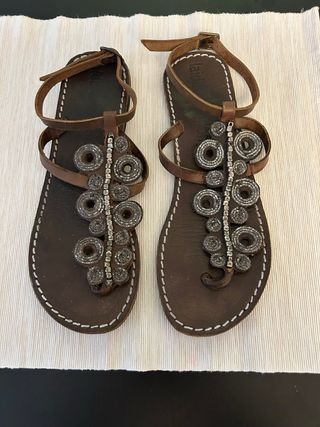 Sandali da donna con decorazioni. - Tomaia in pelle marrone. - Dettagli decorativi con perline e cerchi. - Cinturino alla caviglia regolabile.