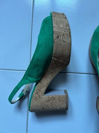 Eleganti scarpe Primadonna verdi con tacco aperto. - Materiale scamosciato. - Cinturino regolabile alla caviglia. - Punta aperta. - Presentano segni di usura nella parte interna (vedi foto)