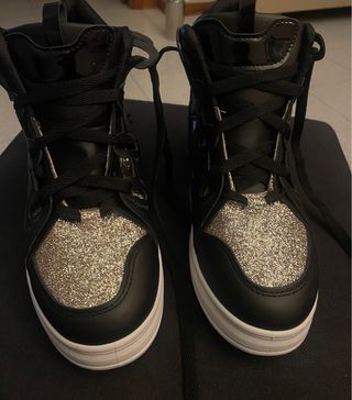 Scarpe sneakers alte con dettagli glitter. - Tomaia in ecopelle nera. - Inserti frontali con glitter oro. - Dettagli lucidi neri. - Suola bianca.