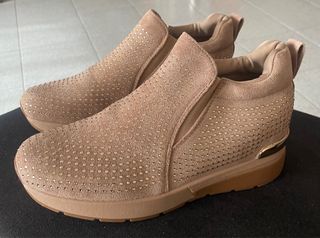 Eleganti scarponcini in camoscio beige, arricchiti da dettagli scintillanti. - Tomaia in camoscio. - Decorazione con strass dorati. - Dettaglio metallico sul tallone.
