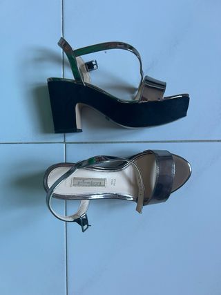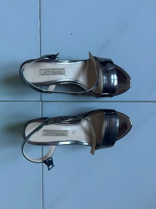 Sandali con zeppa Primadonna, nuovi ma un pochino usurati sulla suola - Colore argento metallizzato. - Cinturino alla caviglia con fibbia. - Zeppa comoda per un look elegante.