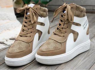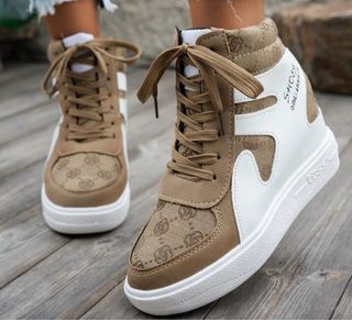 Sneakers alte con un design moderno e accattivante. - Tomaia in tessuto con fantasia monogram. - Inserti in pelle scamosciata. - Dettagli in ecopelle bianca. - Chiusura con lacci. - Suola in gomma bianca. - Tacco interno di circa 4 cm