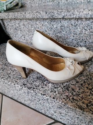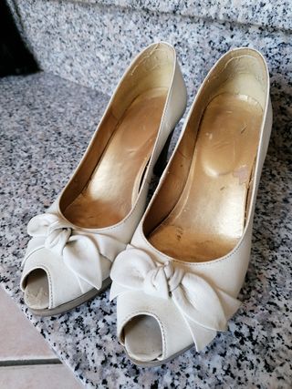 Scarpe da donna n 38, color panna. Fiocco e apertura in cima. Usate in poche occasioni, come da foto 2 imperfezioni dovute al tempo.