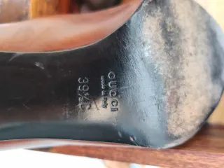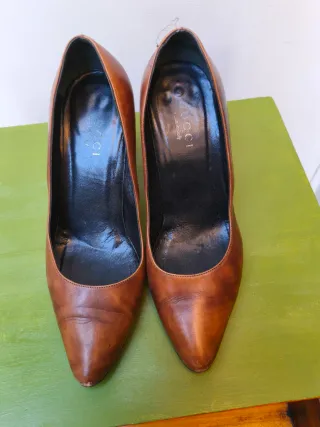 Iconiche décolleté Gucci in pelle di vitello color cuoio/cognac, punta sfilata e tacco 9 cm. Modello elegante e senza tempo, con splendida patina naturale. Taglia 39 ½ C, calzata comoda. Made in Italy. Condizioni: Buono stato generale. Piccola abrasione sulla punta (visibile in foto), leggeri graffi sul tacco, suola con normale usura. Interni puliti e loghi originali ben leggibili. Scarpe firmate con carattere, perfette per look eleganti o cerimonie.