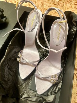 Eleganti sandali Saint Laurent in raso color lilla. - Dettagli con strass sulle fascette anteriori. - Cinturino alla caviglia con fibbia dorata. - Tacco sottile. Tacco: 110mm (slanciano tantissimo!) • Dettagli: Cinturini sottili con fibbie gioiello tempestate di cristalli 💎 • Materiali: Tomaia in tessuto satinato, interno e suola in vera pelle. • Condizioni: Come nuove / Ottime MAI INDOSSATE • Extra: Includo scatola originale e dust bags.